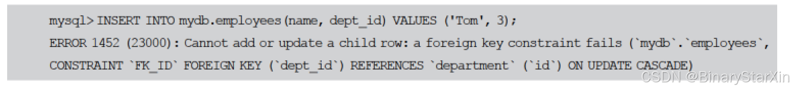 一个具有外键约束的从表在插人数据时,外键字段的值会受主表数据的约束,保证从表插人的数据必须符合约束规范的要求。如从表外键字段不能插人主表中不存在的数据例如,主表 department 中未添加数据时,向 employees 表中插人一条记录(名称为 Tom的用户所属部门编号为 3)。具体 SQL语句及执行结果如下。
