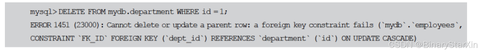 从上述执行结果可知,在删除主表 department 中id等于1的记录时,由于从表employees 中含有部门编号等于1的用户信息,程序就会给出以上的错误提示信息。