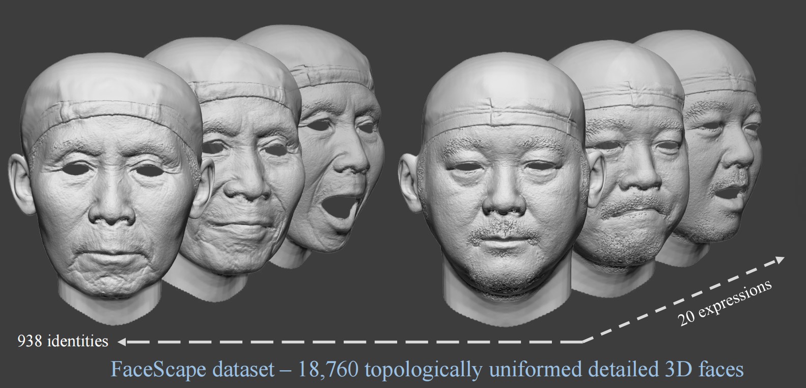 FaceScape: a Large-scale High Quality 3D Face Dataset and Detailed Riggable 3D Face Prediction 1. 简介本文的贡献:提出了一个大尺度高细节的三维人脸数据集FaceScape,采集938个人的20种表情,共18760个三维人脸数据集三维模型具有孔隙级别的精度,并且被处理成拓扑一致性,如果想查看大致形状可使用3DMM系数,如果想更精细一点再加张位移图即可提出了一种基于单张图片进行三维人脸重建并且可以自由编辑的方法方法原始数据—>拓扑一致(+位移图)—>双线性模型(身份和表情维度)先前的方法只能估计大致形状,没有皱纹等小尺度特征,关键的问题在于如何去预测由表情变化导致的小尺