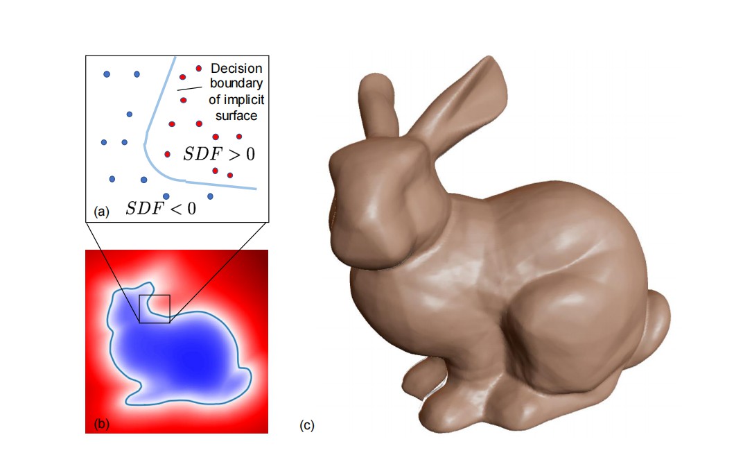 DeepSDF: Learning Continuous Signed Distance Functions for Shape Representation 相关工作3D形状补全类似于2D的计算机视觉里面的图像修复工作,3D形状补全工作的目的是基于一些部分的或离散的输入,推理出这个3D物体全部的形状。比如说给我几个离散的SDF函数的值,我把整个连续的SDF函数给搞出来,给我任意的输入我都能得到应有的数值。之前传统的方式是使用径向基函数(RBF),或者将其看做是一个泊松问题,但是这些方式是以数学理论为依托的,虽然合理性得到了保证,但是缺点就是一次仅仅只能建模一个单一的3D物体。最近随着深度学习的发展,这种3D补全工作开始以数据为驱动,常用的模型便是编码-解码架