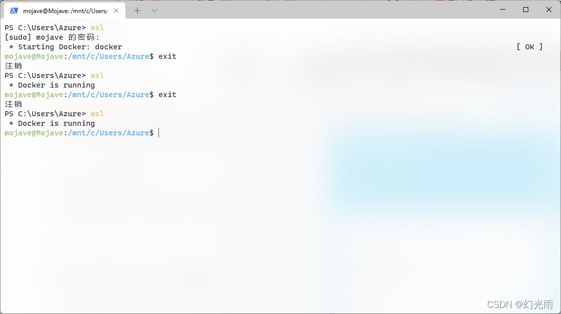 Windows Subsystem For Linux - Ubuntu 20.04 LTS - Docker 自启动 问题WSL 中systemctl enable docker是无效的,无法随Linux而启动,service docker start 是有效的,但这是一次性的操作解决WSL(Ubuntu 20.04) 仍有两个机制正常工作service docker start 仍会在 /var/run下创建docker.pid 新的 terminal 仍会执行 ~/.bashrc所以我可以追加脚本到 ~/.bashrc以随新的终端启动而执行 获取 /var/run/docker.pid
