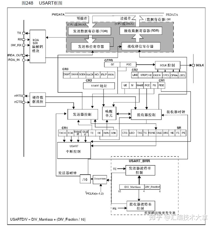 可以看到,接收器时钟和发送器时钟又被连接到同一个控制单元,也就是说它们共用一个波特率发生器。同时也可以看到接收器时钟(发生器时钟)的计算方法、USARTDIV的计算方法。