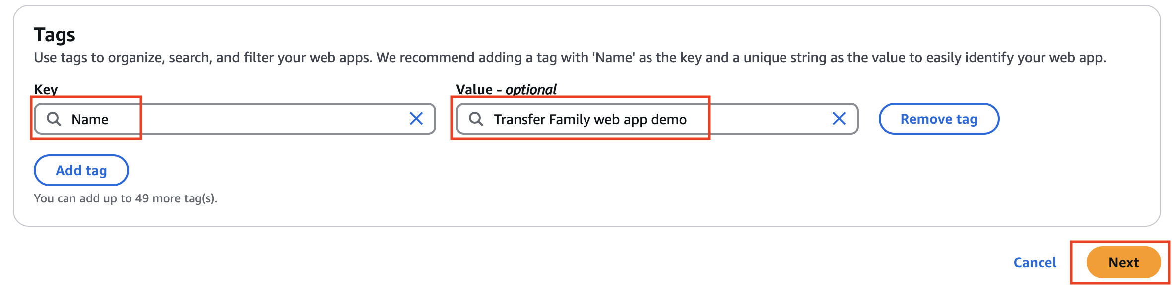 - 对于值,输入 Transfer Family Web 应用程序演示。