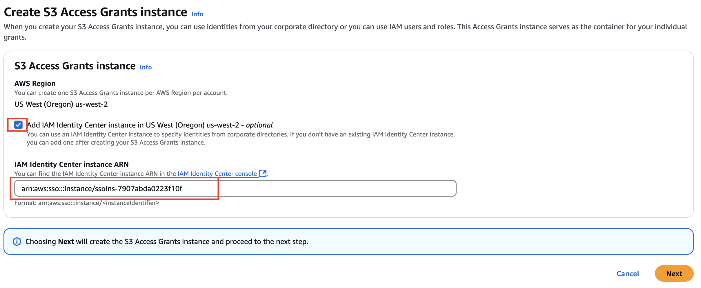 2.选择添加 IAM Identity Center 实例。对于 IAM Identity Center 实例 ARN,输入复制的 InstanceARN,然后选择下一步。
