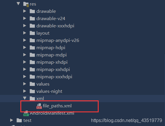 在项目的xml目录中,新建文件file_paths.xml,若没有xml目录请在AndroidStudio中新建Android Resource Directory,Resouce Type中选择xml即可。