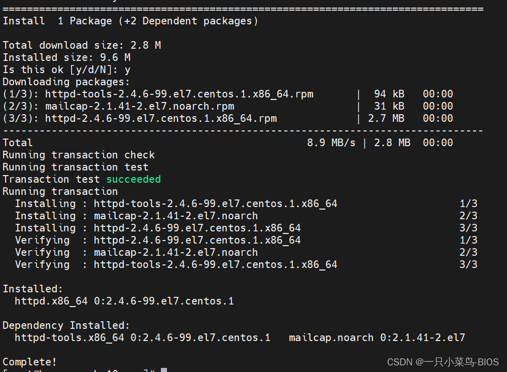 yum install httpd #根据提示,输入Y安装即可成功安装
