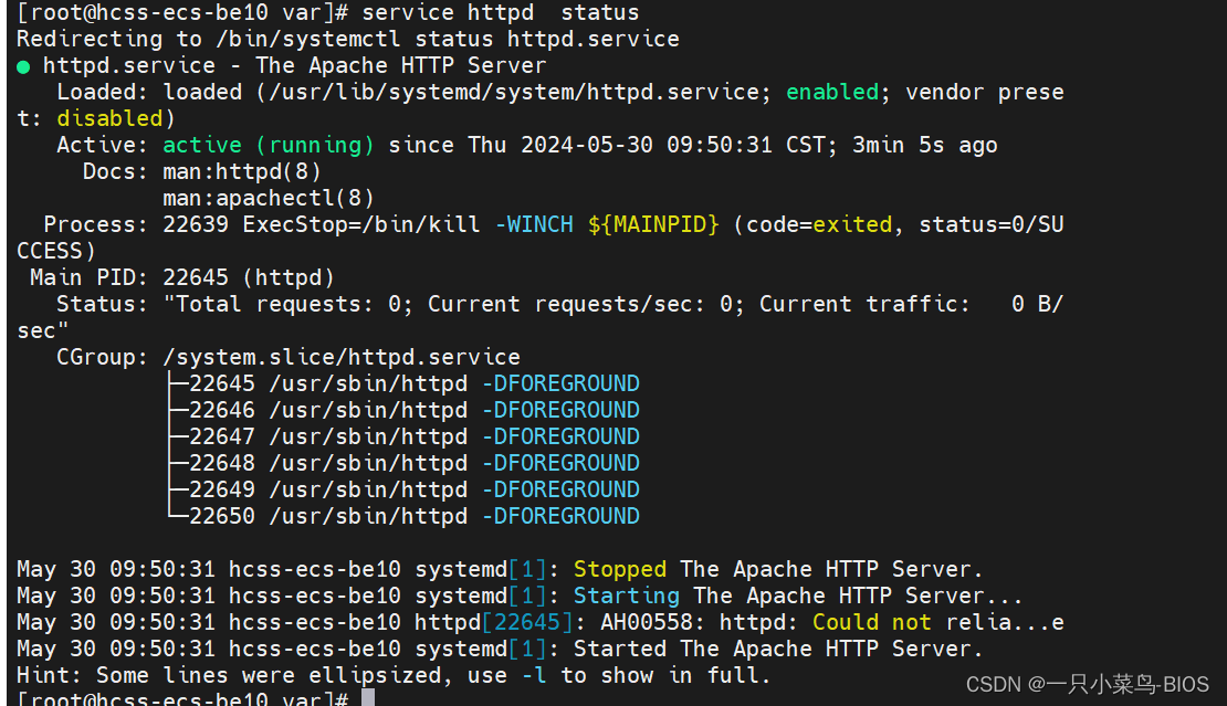 service httpd status #检查http服务状态(会显示绿色的active(running)表示启动成功)