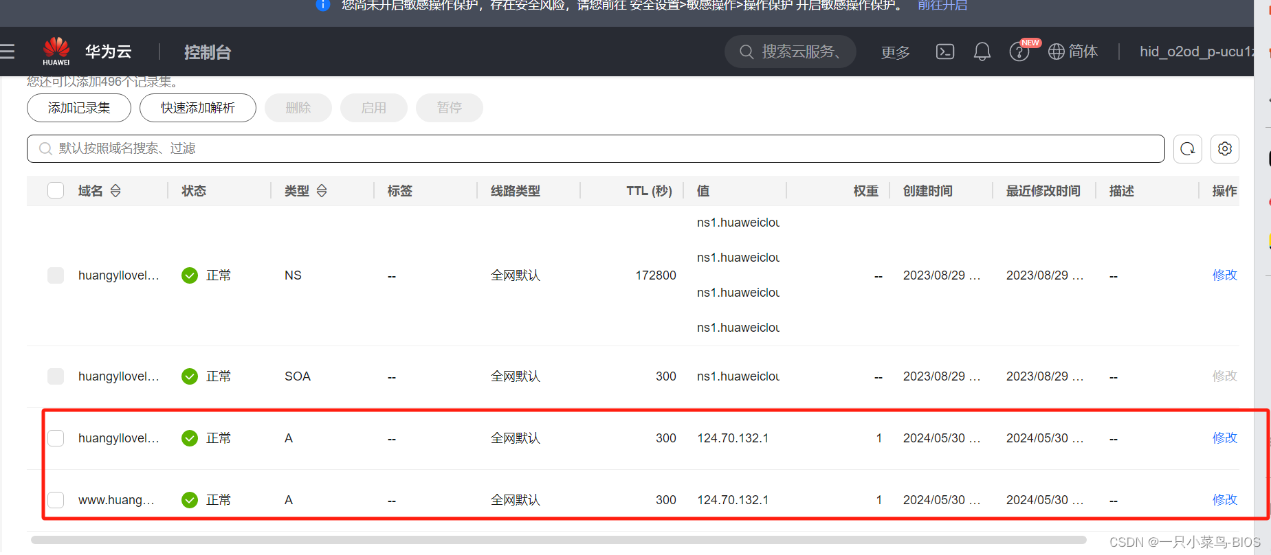 1.需要申请一个域名,然后使用DNS解析服务将对应的公网IP 映射到到自己的网站名,这里使用华为云的域名解析服务