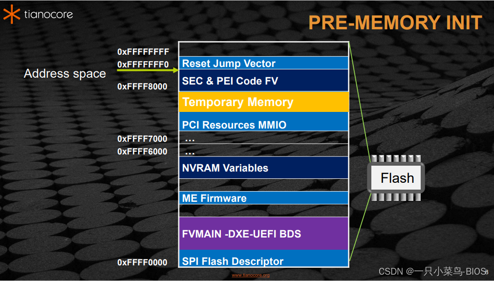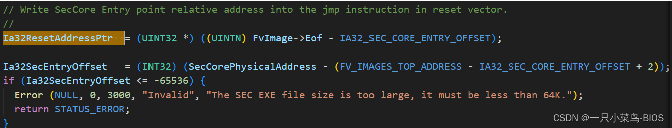 SecCore 也被称之为 VTF,被映射到 Boot Firmware Volume (BFV),BFV 的地址被放置在 0xFFFFFFE0 连续的 4 个字节(小端模式)。 SecCore 是一个 FFS firmware file,其文件末端地址与于 BFV 的末端 地址重合。一般会在,reset vector(地址 0xFFFFFFF0)放置一条跳转指令(ResetVec.nasmb),跳转 到 SecCore 入口,其地址为 PlatformSecLib 的 SecEntry.nasm 汇编_ModuleEntryPoint 宏定义处, SecCore 完成基本的初始化之后会调用 PeiCoreEntry.nasm 内的 CallPeiCoreEntryPoint()函数,跳转到 PeiCore。流程就是 Hardware Reset ->跳转指令->SecEntry.nasm (_ModuleEntryPoint)-> PeiCoreEntry.nasm(CallPeiCoreEntryPoin()))