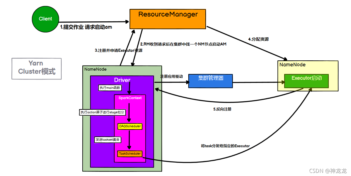2)Driver启动后会和RM通讯申请启动App,RM收到请求后,分配container在合适的NM上,并启动ApplicationMaster