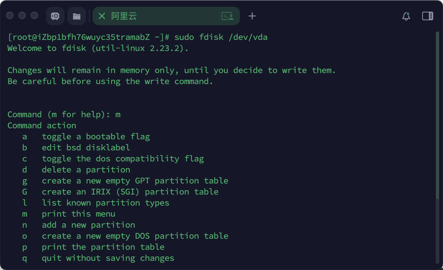 3、在 fdisk 交互界面(就是上面的界面)中执行以下操作: