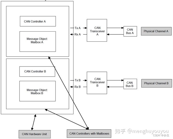 【AUTOSAR CanDrive 1.学习CanDrive的功能和结构】 我们知道CanDrive是通信协议栈中的最底层,之前的文章已经讲了在autosar架构中的Com服务层系列文章 Com通信系列介绍我们废话不多说,直接进入今天的主题为了与文档描述保持一致,下文将使用CAN模块来表示CAN Driver。简单地说,CAN模块属于一部分的最底层内容,其作用是执行硬件访问和为上层提供独立的硬件接口(这里能访问CAN模块的上层只有Can Interface模块)。说到访问硬件,先了解几个概念,如下图所示:对图内容的解释如下:首先我们说一下Can Drive驱动状态机CAN模块驱
