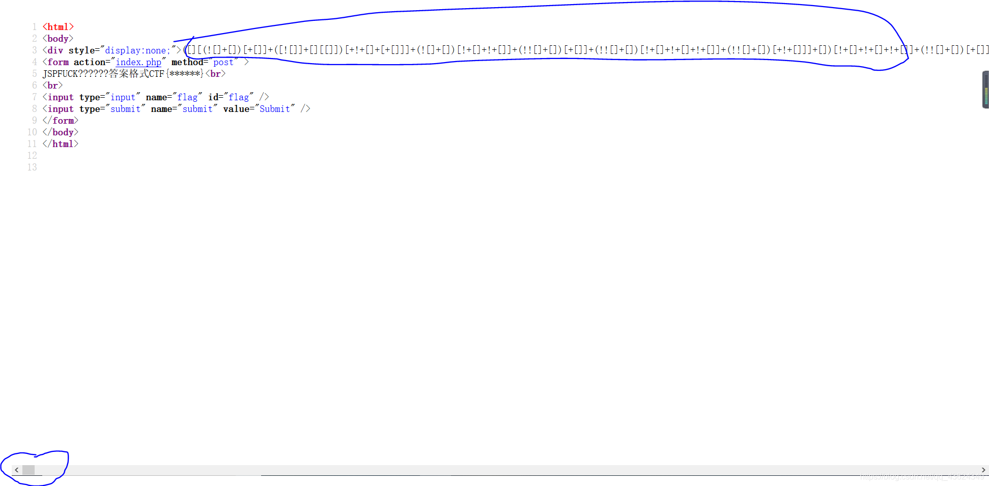 我们第一思路肯定是查看源代码,发现有很长的一串字符,