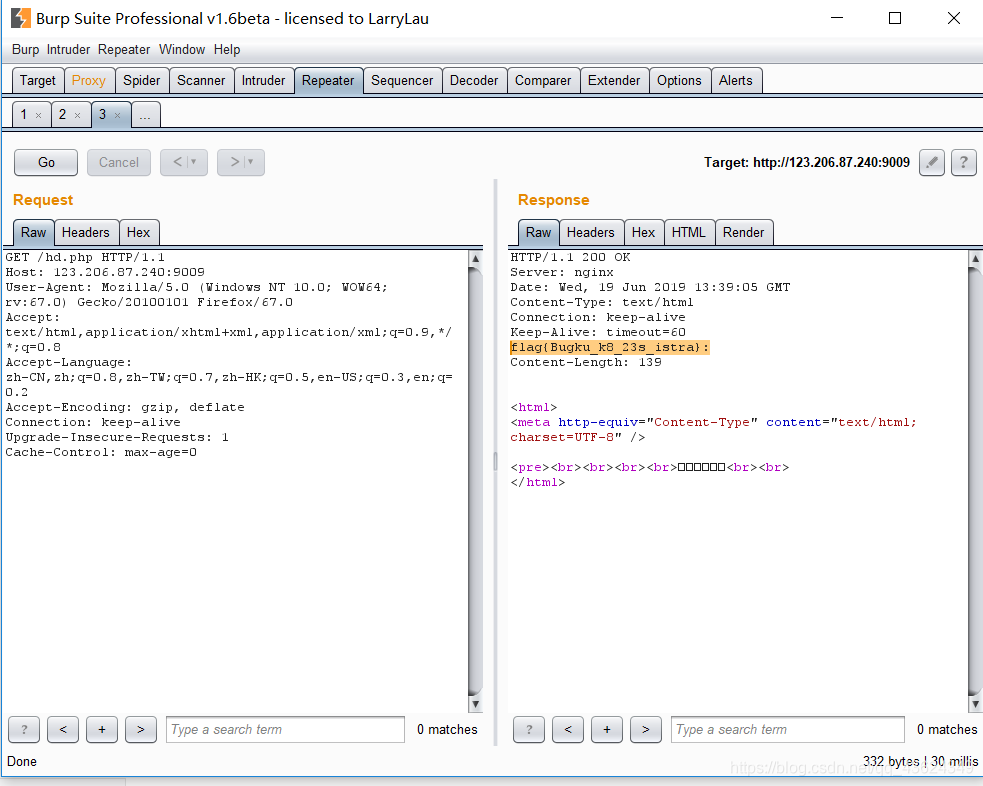 也没发现什么有用的信息,然后我们再用bp抓包看有没有什么可以用的东西。很幸运,抓完解出来就直接出现flag了