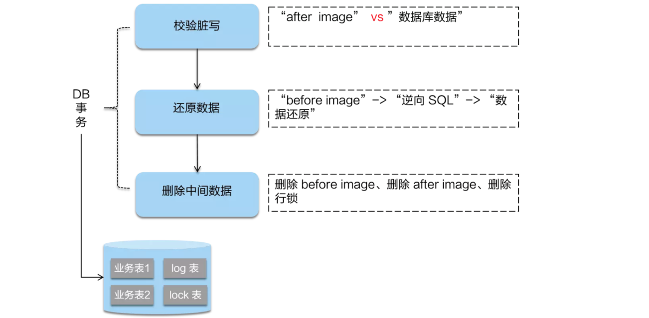 二阶段如果是回滚的话,Seata 就需要回滚一阶段已经执行的“业务 SQL”,还原业务数据。回滚方式便是用“before image”还原业务数据;但在还原前要首先要校验脏写,对比“数据库当前业务数据”和 “after image”,如果两份数据完全一致就说明没有脏写,可以还原业务数据,如果不一致就说明有脏写,出现脏写就需要转人工处理。