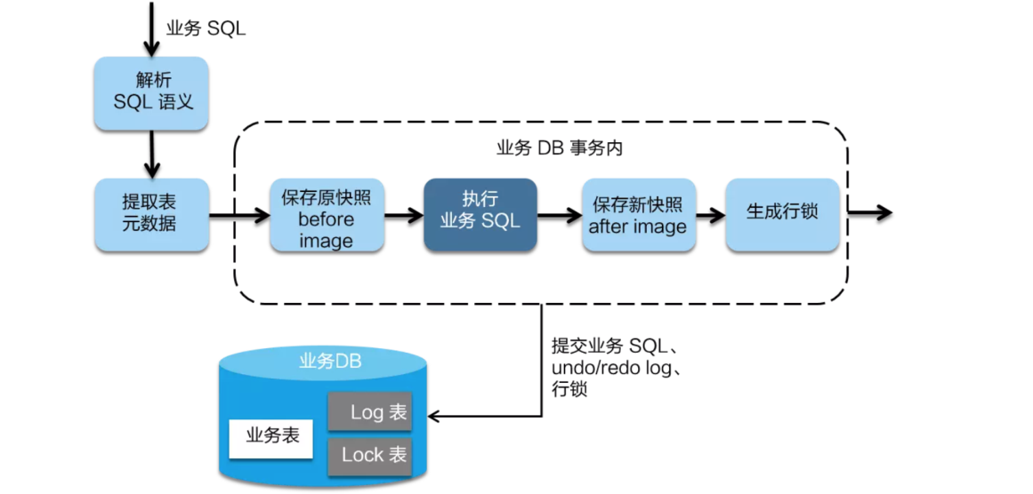 在一阶段,Seata 会拦截“业务 SQL”,首先解析 SQL 语义,找到“业务 SQL”要更新的业务数据,在业务数据被更新前,将其保存成“before image”,然后执行“业务 SQL”更新业务数据,在业务数据更新之后,再将其保存成“after image”,最后生成行锁。以上操作全部在一个数据库事务内完成,这样保证了一阶段操作的原子性。
