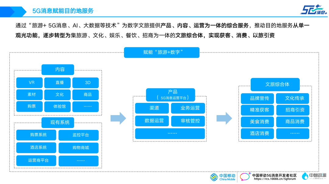 并以【数字鼓浪屿】、【永定客家土楼】两个5G消息进行举例,体现5G消息可以全面赋能旅游目的地服务,贯穿吃住行游购娱全流程,提升游客体验。同时以5G消息为总线,赋能已有文旅素材、平台,实现5G消息融合服务。