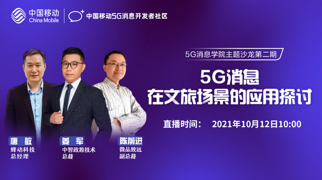 由【中国移动5G消息开发者社区】举办的第二期【5G消息学院主题沙龙】已顺利举行。本期沙龙以“5G消息在文旅场景的应用探讨”为主题,特别邀请了广东蜂动科技有限公司总经理唐敏、小源集团联合创始人、中智政源技术有限公司总裁姜军、深圳微品致远信息科技有限公司副总裁陈前进展开主题分享和探讨交流,并在开播之后就迅速吸引了众多开发者们的围观参与。