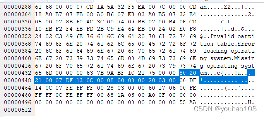 驱动器的状态储存在MBR结束标志55 AA 的前64个字节中,一共有四个分区表项,每个分区表项为16个字节,每个分区表项的第一个字节为分区是否活动的标识位(00代表此分区为非活动分区,80代表分区为活动分区)