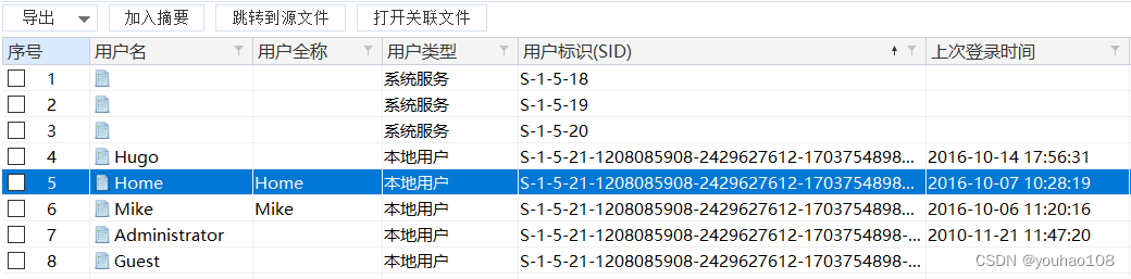 通过取证大师的自动取证,我们可以在系统信息,用户信息中找到用户的登陆时间