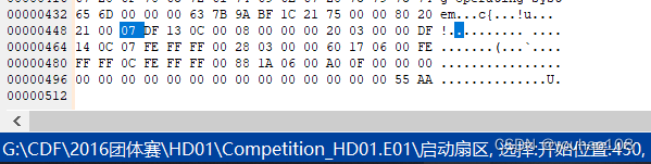 07标志该活动分区的文件系统类型为NTFS,偏移量为450