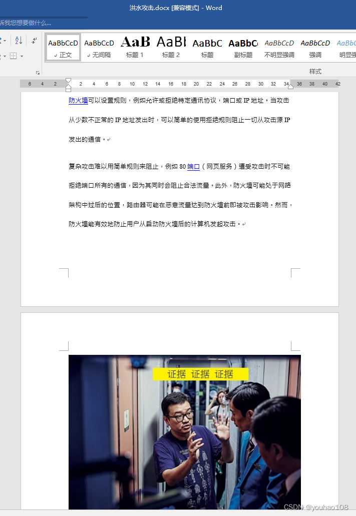 题目中提到文件包含,那么考虑能包含的多为压缩包zip、rar、文档doc、docx、pdf等文件里可以包含,在hugo文件夹下查找*.docx文件,发现在洪水攻击.docx中出现证据相关图片