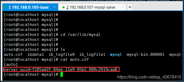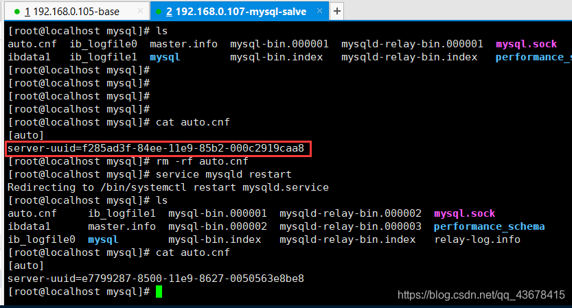 如果出现这种情况,需要将 /var/lib/mysql 文件下的生成uuid 的文件删除,然后再重新启动 mysql 服务,就会重新在生成一个 server-uuid,在下图2中 也 显示了这个重新生成的server-uuid。