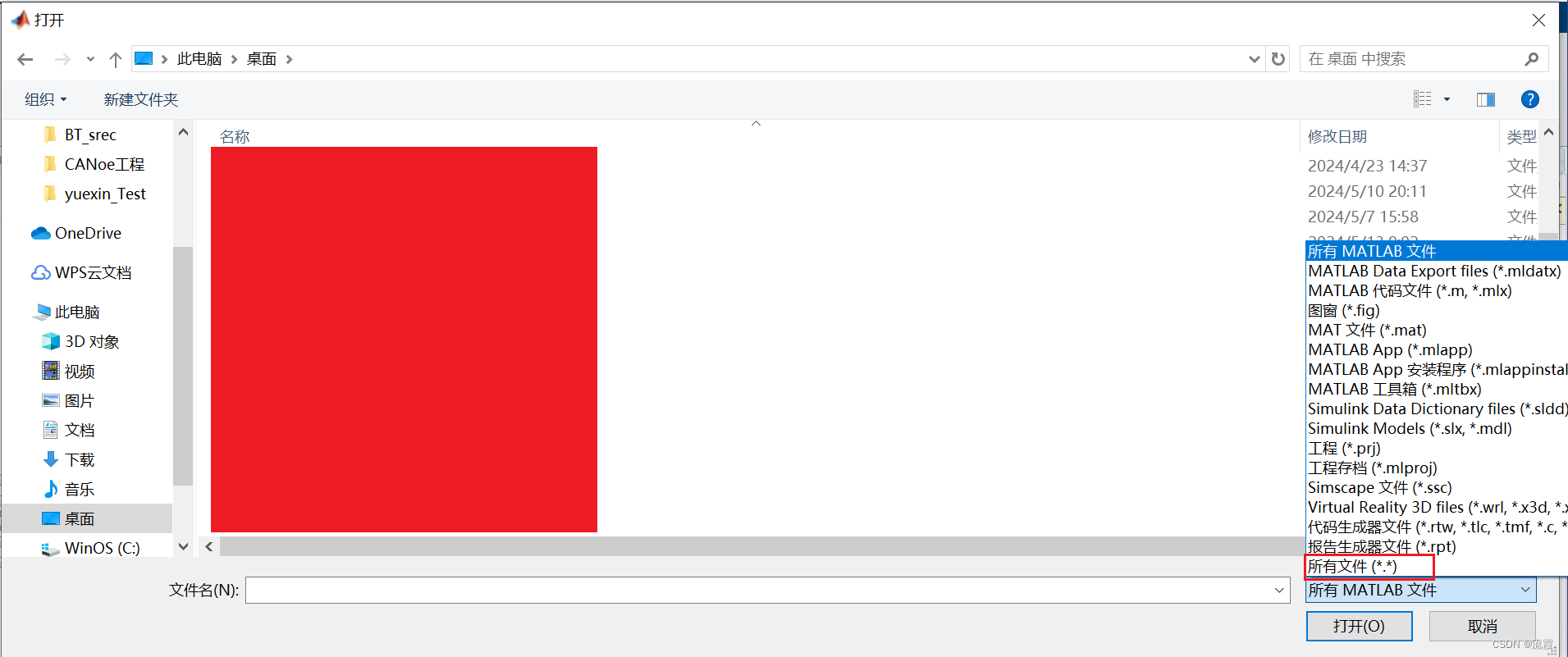 6.选择打开类型为所有文件