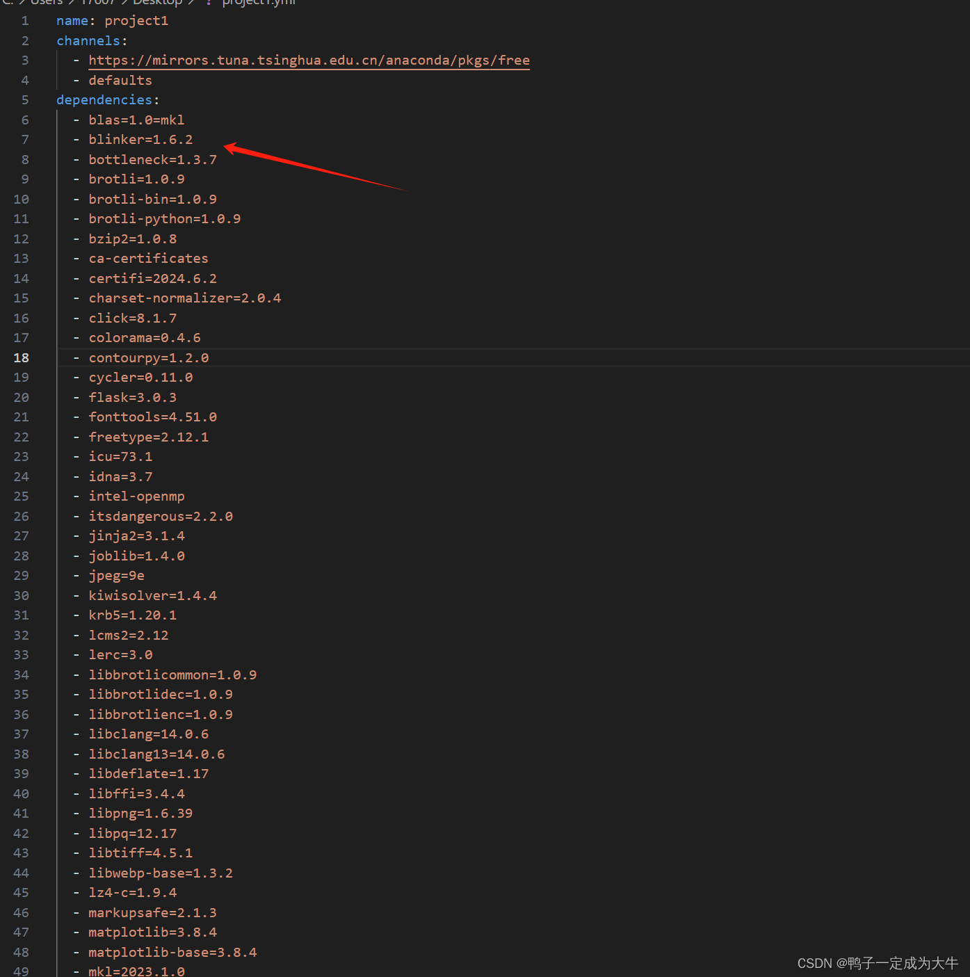 4、第四步,将文件最后那句prefix: D:\Miniconda\envs\project1给删掉,整个prefix这一行,因为没啥用。