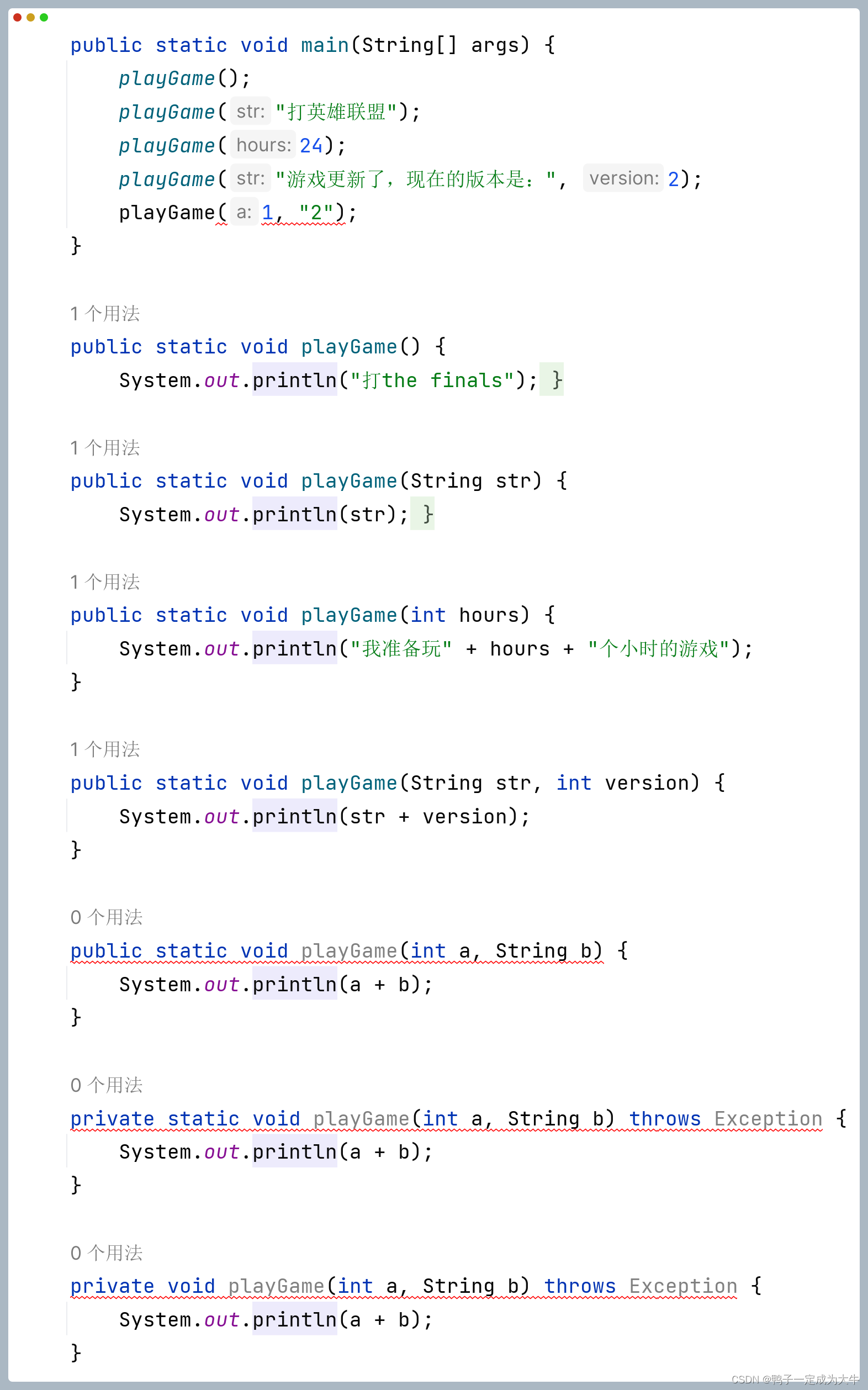 2、定义两个相同的方法名,与参数列表的方法,会在编译时报错。