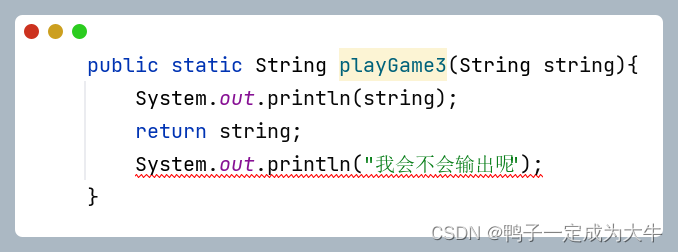 4、return语句下面,不能编写代码,因为永远执行不到,属于无效代码,会在代码编译期间就报错。例如: