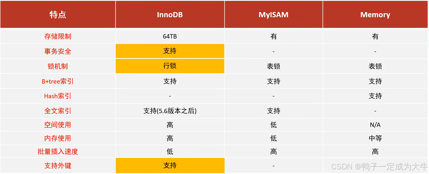 - 支持外键 FOREIGN KEY 约束,保证数据的完整性和正确性