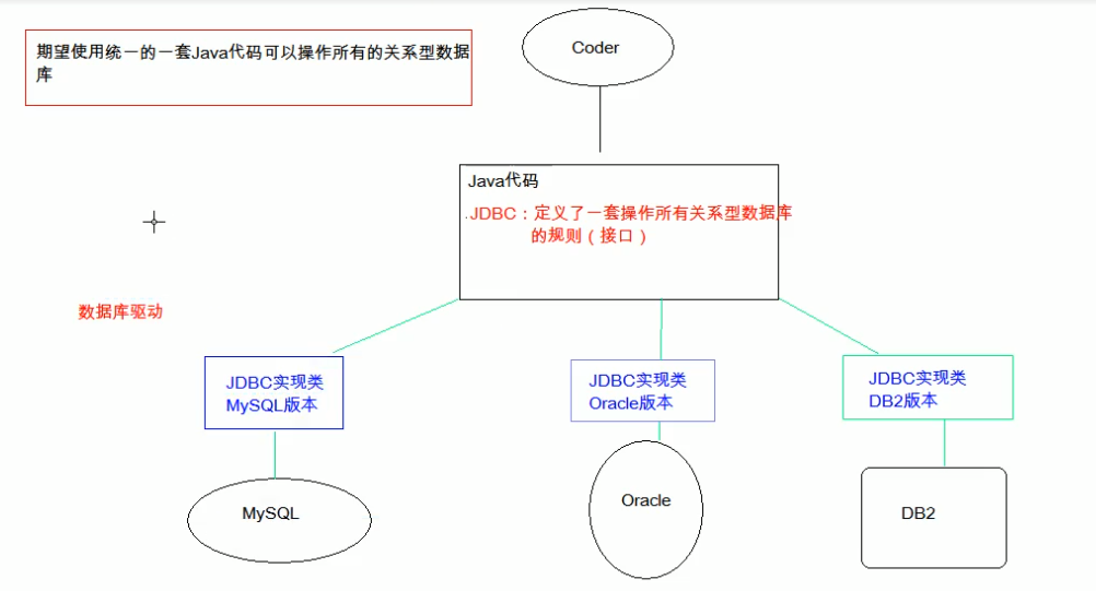 1、基本概念1.1 概念:JDBC——Java、DataBase、Connectivity。Java数据库连接,Java语言操作数据库。(使用Java语言连接数据库)2.2 本质:其实,就是官方(sun公司)定义的一套操作所有关系型数据库的规则,即接口。各个数据库厂商去实现这套接口,提供数据库驱动jar包。我们可以使用这套接口(JDBC)编程,真正执行的代码的驱动jar包中的实现类。(使用统一的一套Java代码可以操作所有的关系型数据库,如MySQL、Oracle、DB2)定义了一套操作