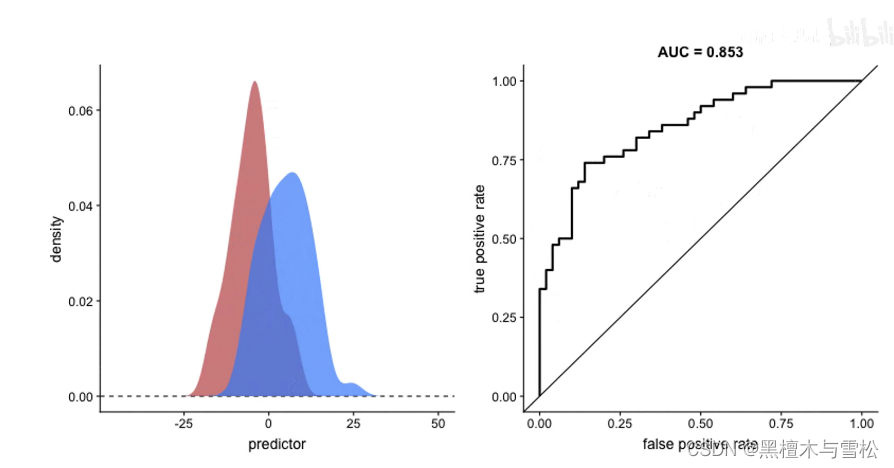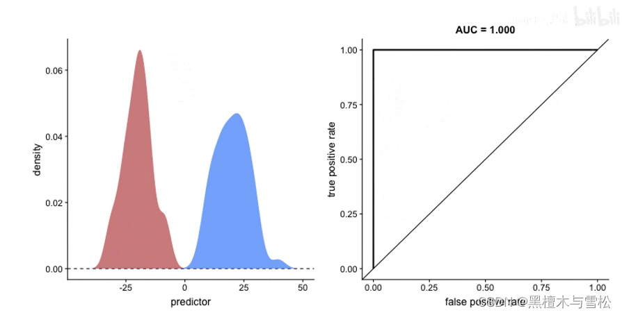 ROC曲线是由TPR和FPR构成的,完美曲线是左上三角曲线,曲线越接近左上角,分的越好,数据分开的越开,分类效果越好。