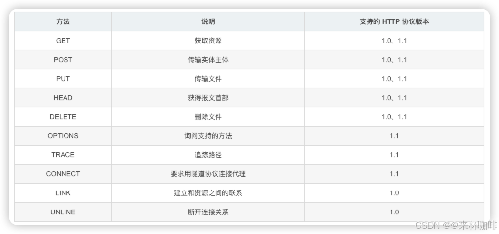下表列出了 HTTP/1.0 和 HTTP/1.1 支持的方法。另外,方法名区分大小写,注意要用大写字母。