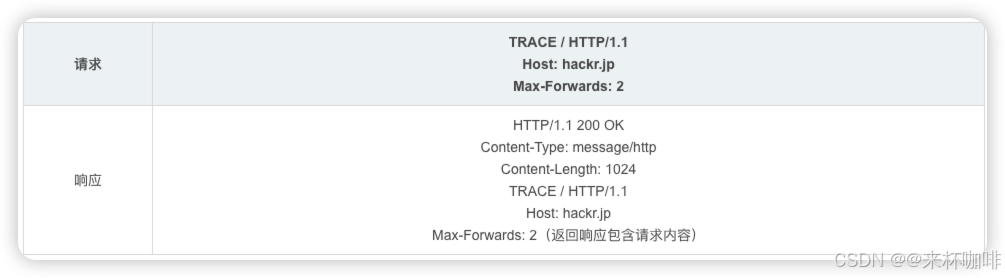 客户端通过 TRACE 方法可以查询发送出去的请求是怎样被加工修改/ 篡改的。这是因为,请求想要连接到源目标服务器可能会通过代理中转,TRACE 方法就是用来确认连接过程中发生的一系列操作。