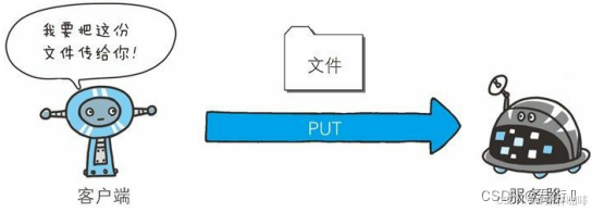 PUT 方法用来传输文件。就像 FTP 协议的文件上传一样,要求在请求报文的主体中包含文件内容,然后保存到请求 URI 指定的位置。