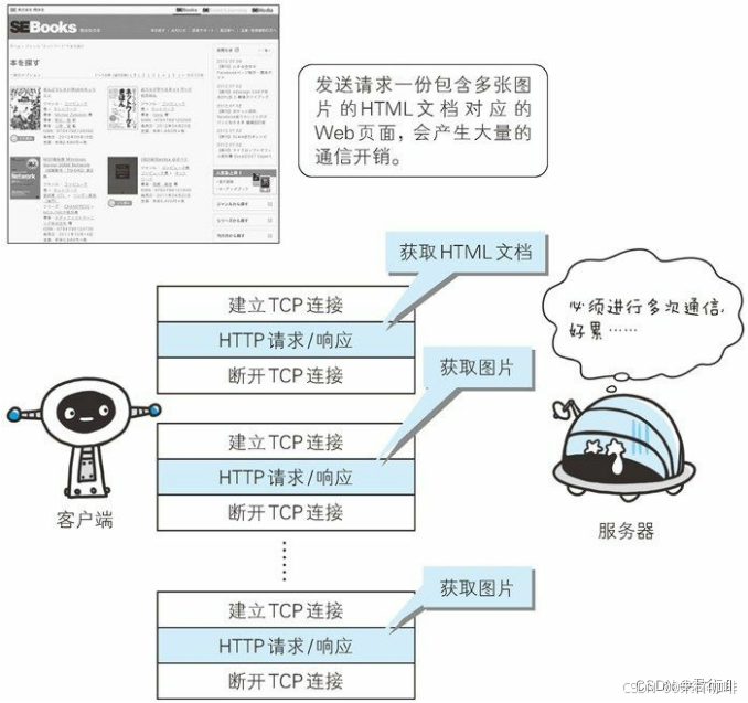 以当年的通信情况来说,因为都是些容量很小的文本传输,所以即使这样也没有多大问题。可随着 HTTP 的普及,文档中包含大量图片的情况多了起来。