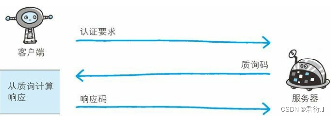 所谓质询响应方式是指,一开始一方会先发送认证要求给另一方,接着使用从另一方那接收到的质询码计算生成响应码。最后将响应码返回给对方进行认证的方式。