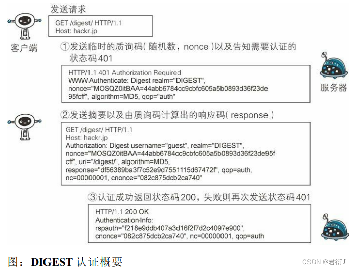 为弥补 BASIC 认证存在的弱点,从 HTTP/1.1 起就有了 DIGEST 认证。 DIGEST 认证同样使用质询 / 响应的方式(challenge/response),但不会像 BASIC 认证那样直接发送明文密码。