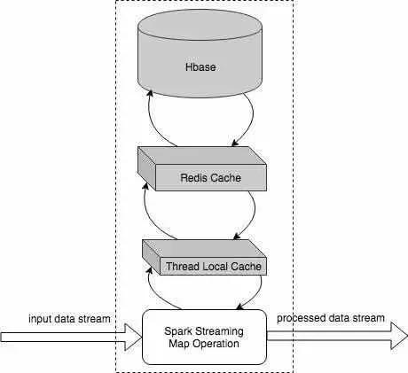 判断一个用户是不是新用户,最简单的办法就是维护一个历史用户池,对每条日志判断该用户是否存在于用户池中。由于日志量巨大,为了不影响 Streaming任务的处理速度,我们设计了两层缓存:Thread Local Cache和Redis Cache,同时用HBase做持久化存储以保存历史用户。访问速度:本地内存 > 远端内存 > 远端磁盘,对于我们这个任务来说,只有1%左右的请求会打到HBase,日志高峰期26w/s,完全不会影响任务的实时性。当然本地缓存LruCache的容量大小和Redis的性能也是影响实时性的两个因素。