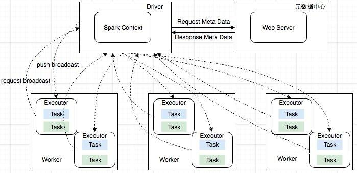 我们可以把经常变化的元数据作为Streaming Broadcast变量,该变量扮演的角色类似于只读缓存,同时针对该变量可设置TTL,缓存过期后Executor节点会重新向Driver请求最新的变量。通过这种机制可以非常自然的将元数据的变化映射到数据流上,无需重启任务也无需通知程序的维护者。