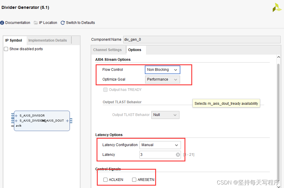 更正:之前说的输入使能和数据要保持至少两个时钟是错误的,根据ip手册里面只能得出在使能和tready信号都有效的时刻的数据才是输入数据,但是至于要使能之后几个时钟tready才变成有效是不确定的(tready是out信号),所以如果只是单纯用除法ip,可以使用第二种阻塞模式,将使能输入信号一直有效,就可以计算所有数据。但如果是要和其他模块进行级联计算,那么就可以使用非阻塞模式,然后通过使用状态机去使能除数和被除数的信号,在拉高使能信号后,进入下一个状态,并开始判断tready是否有效,有效之后就拉低使能信号,就可以只计算一次呢,注意数据的周期就要尽可能大于tready拉高的时间。
