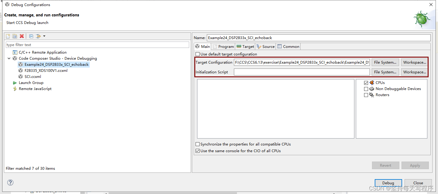 2.在target configuration处更改为:${target_config_active_default:Example24_DSP2833x_SCI_echoback}