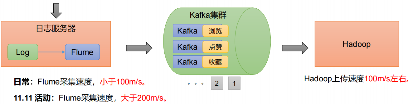 日常由于磁盘的读取速度是100M/S 左右,日常flume --> Hadoop 是可以的,但是双十一的话,采集速度超过100M/S 就会造成 Hadoop无法处理的情况,此时可以使用KAFKA.