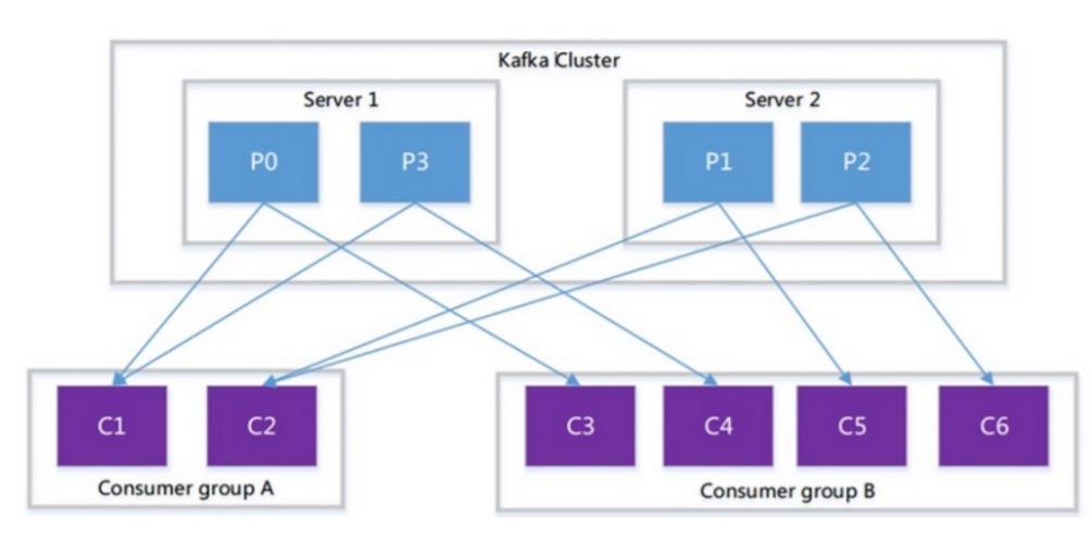 Consumer group A 有两个消费者来读取4个partition中数据;Consumer group B有四个消费者来读取4个 partition中的数据