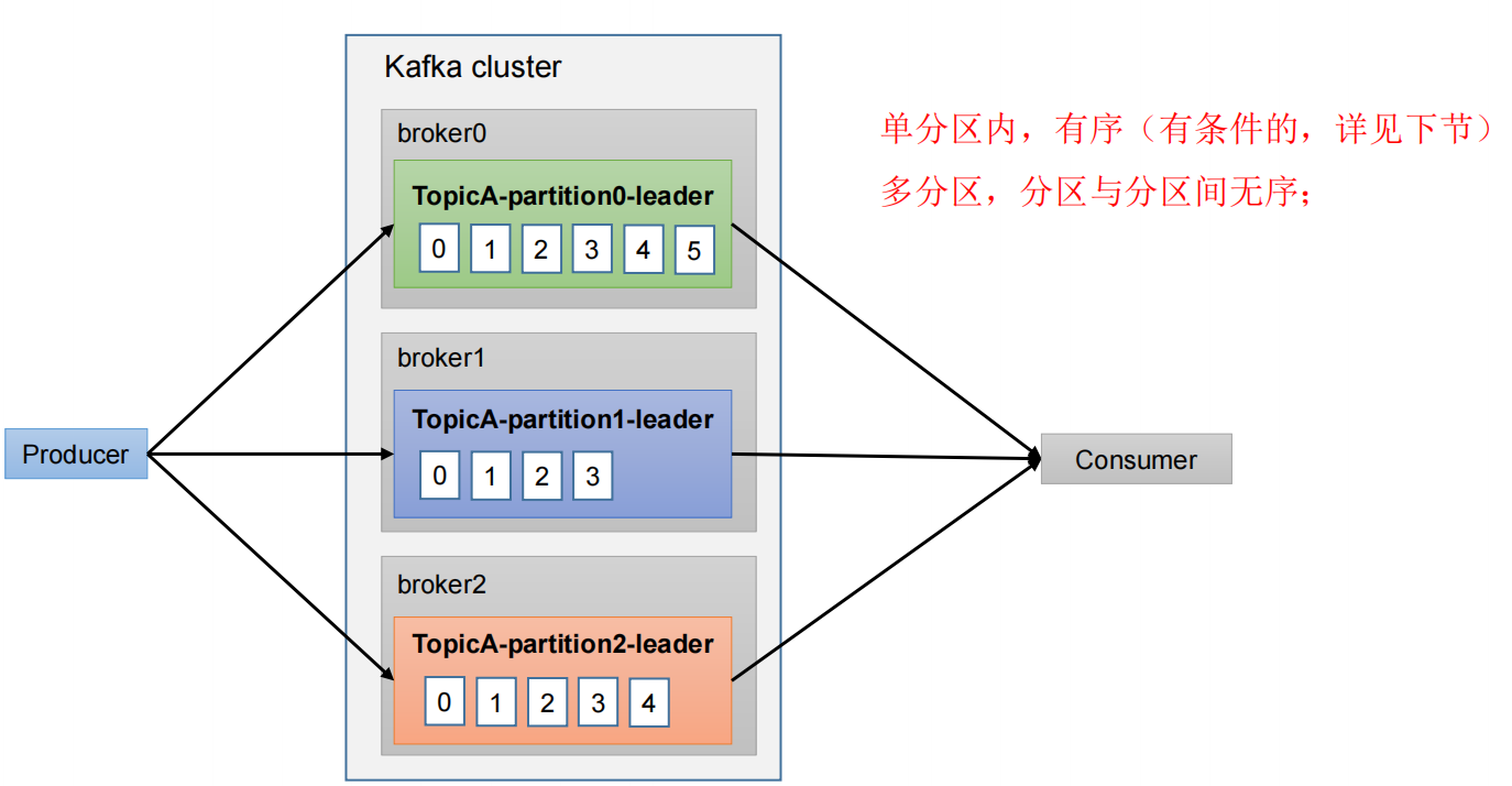 生产者发送的数据,单分区内可以做到有序,多分区,无法保证,除非把多个分区的数据拉到消费者端,进行排序,但这样做需要等,效率很低,还不如直接设置一个分区。