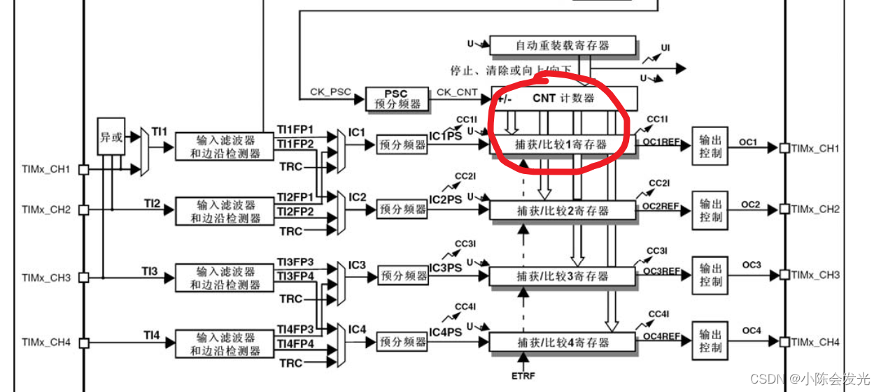 STM32定时器输出比较输出PWM波形、输入捕获功能 输出比较可以用来比较与值的关系,来操作输出电平,可以用来输出一定频率和占空比的PWM波形。注:同一个定时器捕获/比较寄存器是共用的,不可同时开启。每个高级定时器和通用定时器都有4个输出比较通道。高级定时器的前三个通道额外有死区生成和互补输出的功能。