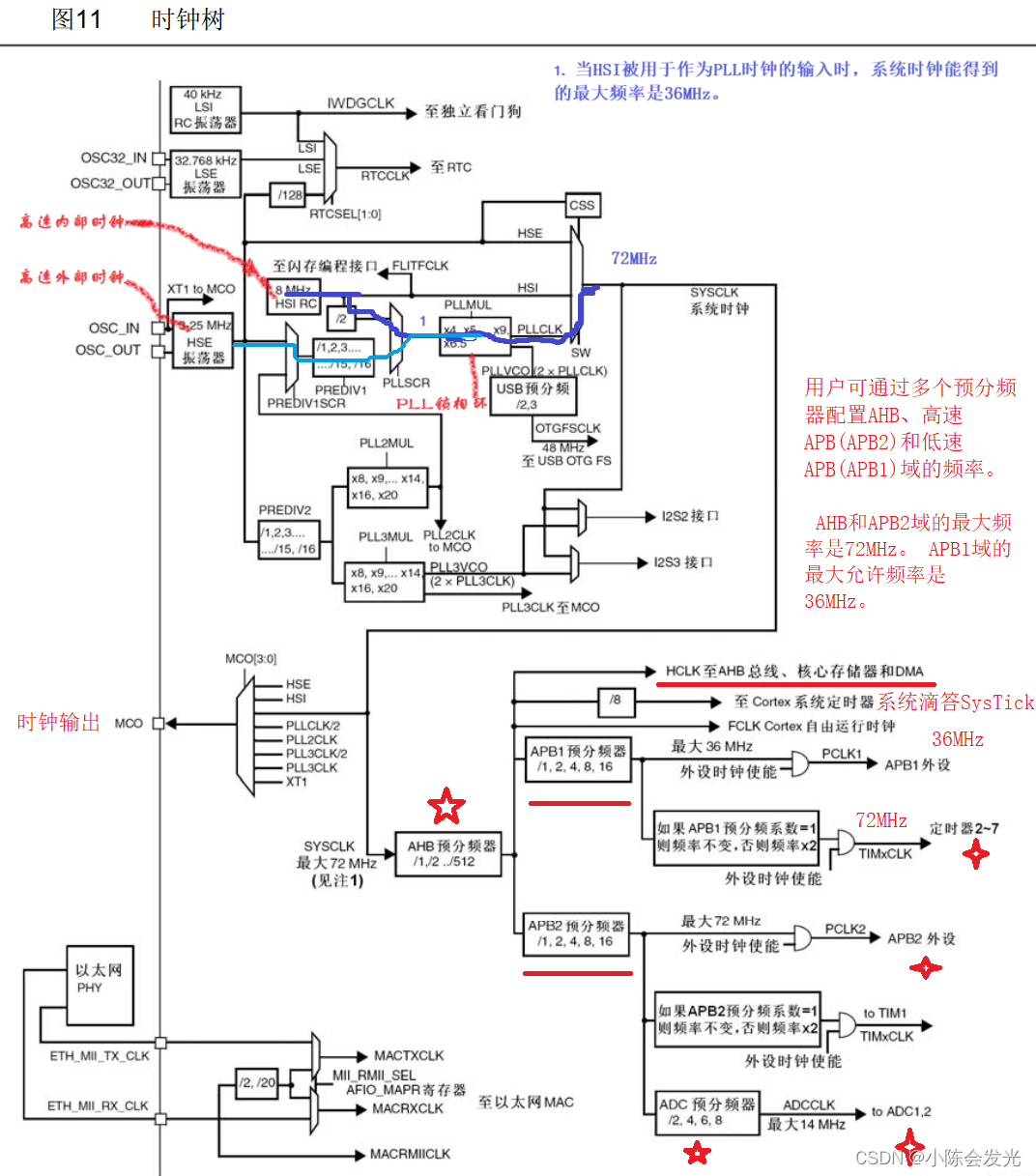 STM32时钟树和定时器详解 以下三种不同的时钟源可被用来驱动系统时钟(SYSCLK)HSI时钟信号由内部8MHz的RC振荡器产生,可直接作为系统时钟或在2分频后作为PLL输入。来源为外部无源晶振,速度8M(可提供精确主时钟)。来源为HSI/2或HSE经过倍频所得。其余为:LSE(低速外部时钟):一个32.768kHz的低速外部晶体或陶瓷谐振器。它为实时时钟或者其他定时功能提供一个低功耗且精确的时钟源。LSI(低速内部时钟):一个低功耗时钟源的角色,它可以在停机和待机模式下保持运行为独立看门狗和自动唤醒单元提供时钟。