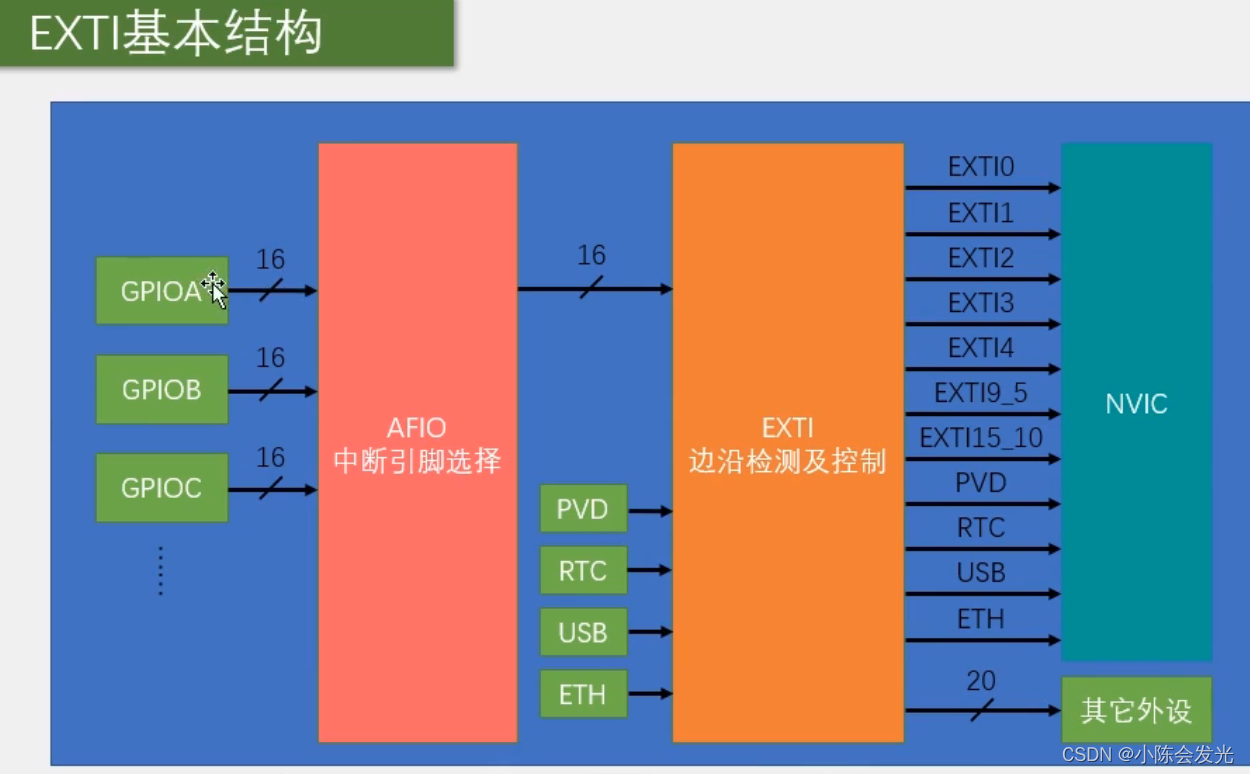 STM32外部中断EXTI介绍及配置(标准库)详解 介绍为从右往左EXTI可以监测指定GPIO口的电平信号,当指定的GPIO口的电平信号发生改变的时候,EXTI立即向NVIC发送中断申请,经过NVIC裁决后中断CPU主程序执行EXTI中断程序。上升沿、下降沿、软件触发所有的GPIO口,但相同的Pin不能同时触发中断PA0和PB0只能触发其中的一个,如下图,共有16个外部中断线路,下图只截取了其中一个共16个。EXTI支持20个中断和时间屏蔽位下图中,GPIO端口连接到16个外部中断/事件线上;
